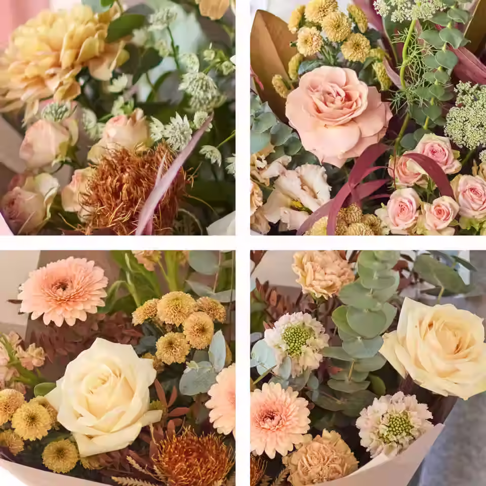 The sun rises over peaceful autumn trees and all around is quiet and beauty. That's what our autumn on trend collection is all about, with this bouquet capturing the soft texture and colour of the season. Expect to see blooms, fresh and dried, in shades of cream, apricot, russet and chocolate. Stunning.